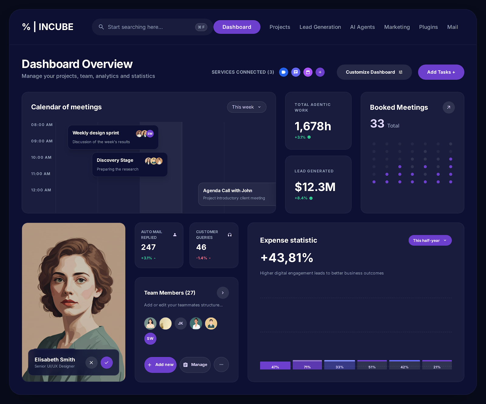 Incube connects your tools, teams, and data into a single intelligent system. No more scattered software. No more manual handoffs. Just seamless operations - designed to scale